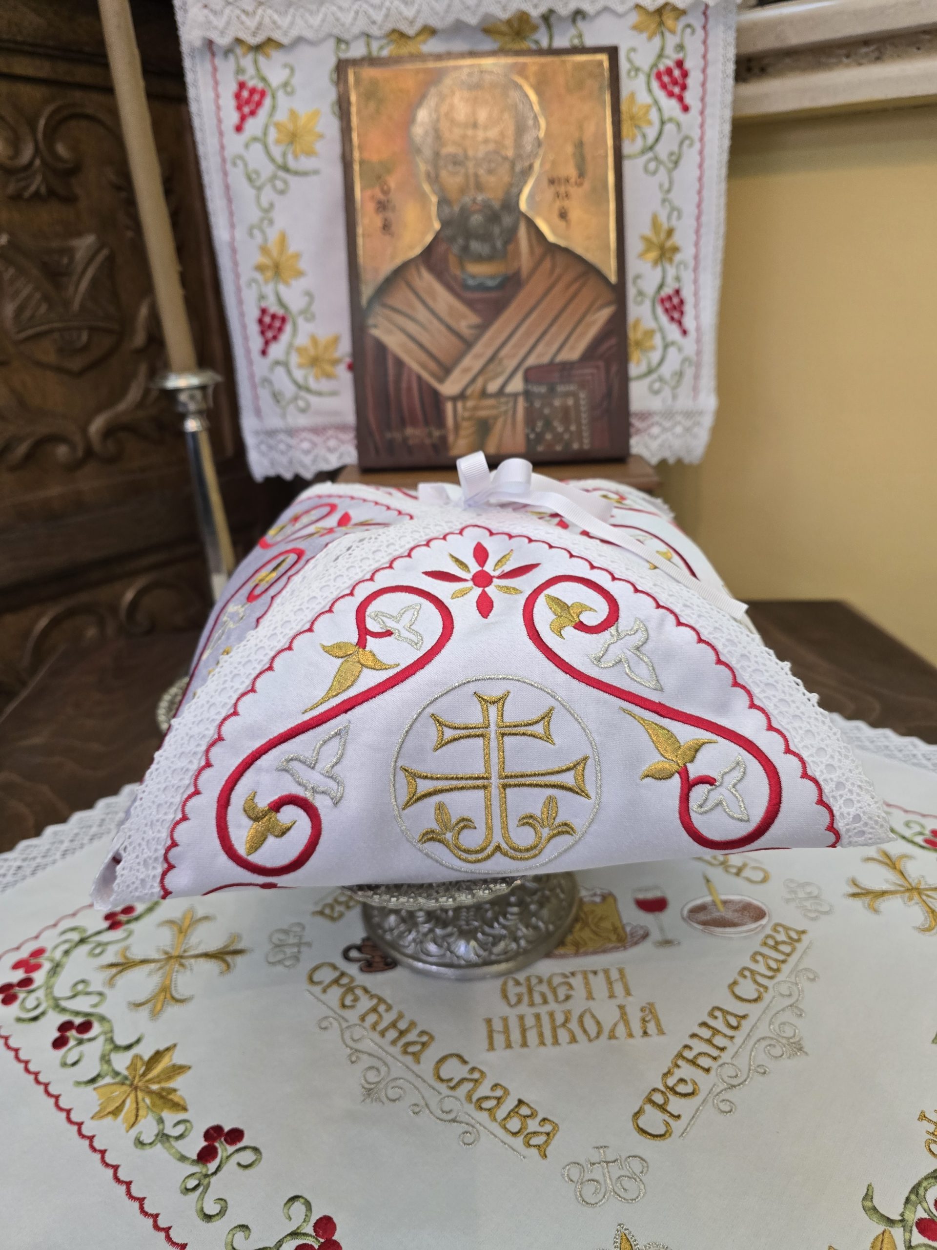Тако и ми по узору на наше претке а по рецепту наших бака веземо платна за славски колач али са печатом нашег дугогодишњег рада и искуства. И свако ко погледа на наша везена славска платна одмах мора препознати да се ради о посебним везеним платнима за славски колач која се издвајају од осталих. И заиста речи постају сувишне јер овде говори вез.
